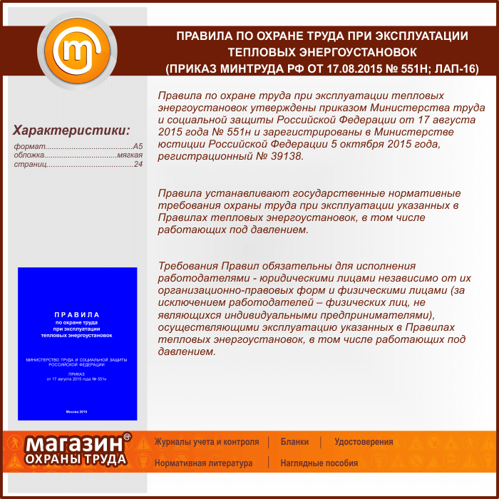 Правила по охране труда при эксплуатации тепловых энергоустановок (Приказ Минтруда РФ от 17.08.2015 № 551н) (ЛАП-16)