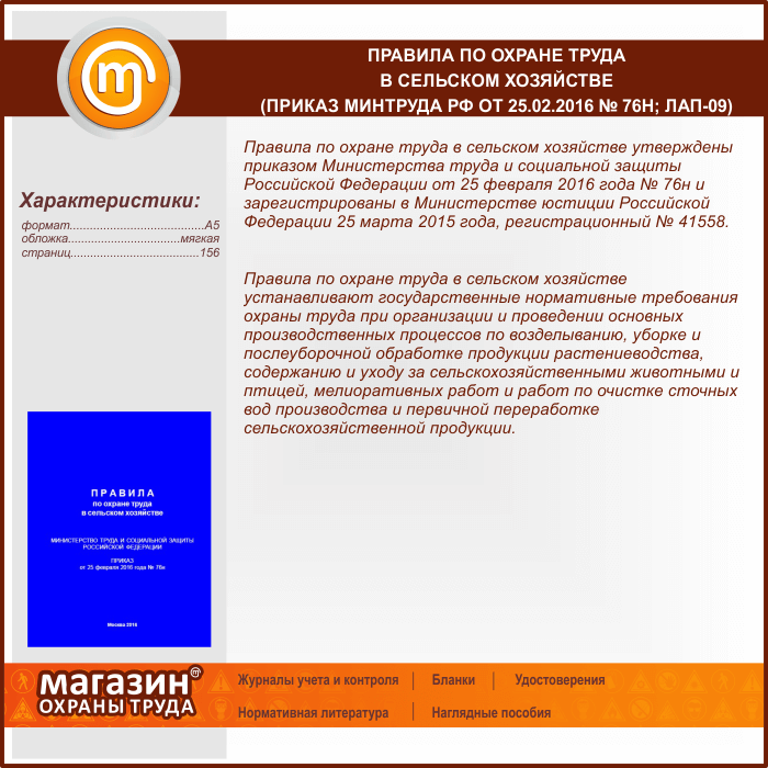 Правила по охране труда в сельском хозяйстве (Приказ Минтруда РФ от 25.02.2016 № 76н) (ЛАП-09)