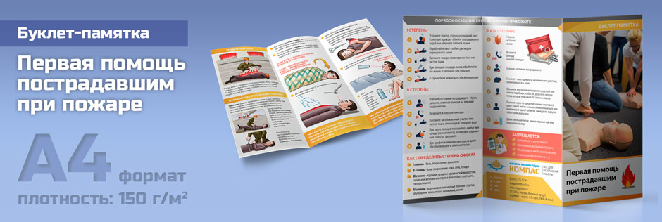 Друзья, с радостью представляем Вам нашу новинку – буклет-памятку «Первая помощь пострадавшим при пожаре». Буклет изготовлен из качественной белой бумаги плотностью 150 г/м2. Изображение печатается с двух сторон, после чего лист фальцуется (складывается) в несколько изгибов гармошкой