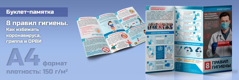 Друзья, с радостью представляем Вам нашу новинку – буклет-памятку «Восемь правил гигиены. Как избежать коронавируса, гриппа и ОРВИ». Буклет изготовлен из качественной белой бумаги плотностью 150 г/м2. Изображение печатается с двух сторон, после чего лист фальцуется (складывается) в несколько изгибов гармошкой