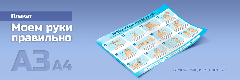 Друзья, с радостью представляем Вам нашу новинку – Плакат «Моем руки правильно», стандартно изготавливаемый в А4 и А3 форматах на самоклеящейся пленке. По вашему желанию плакат может быть изготовлен на ламинированной бумаге, 2-мм пластике, баннерной ткани и даже металле