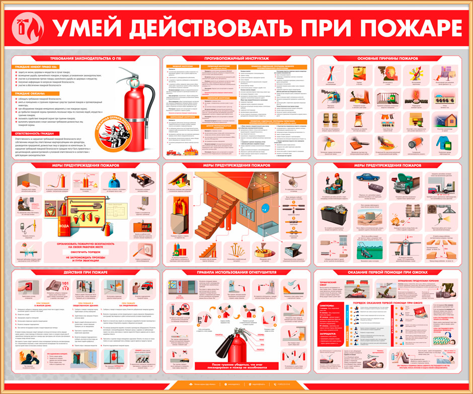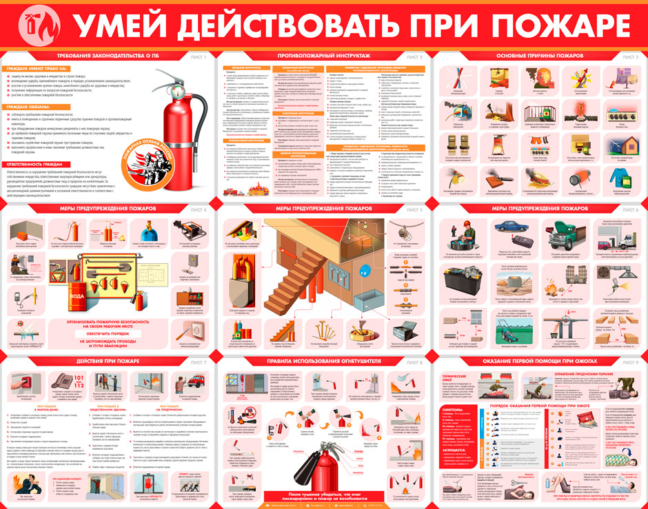 Комплекты плакатов и стенды «Умей действовать при пожаре» содержат самые важные аспекты пожарной безопасности. Чисто теоретических плакатов здесь всего два – «Требования законодательства о ПБ» и «Противопожарный инструктаж». Все же остальные – максимально практичные и наглядно объясняют причины пожаров, как их не допустить и что делать, если пожар все же произошел. Также подробно освещена тема оказания первой помощи при ожогах разной степени тяжести. Как всегда, только актуальная информация, качественные иллюстрации и современный дизайн!