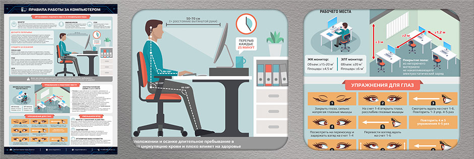 Плакат «Правила работы за компьютером» содержит новейшую, актуальную информацию о правилах работы за ПК. При разработке плаката мы опирались не только на СанПиН 2.2.2/2.4.1340-03 "Гигиенические требования к персональным электронно-вычислительным машинам и организации работы", но и на информацию из международных источниковИз данного плаката вы узнаете о правильной позе, эргономике рабочего места, периодичности перерывов в работе, требованиях к рабочему месту согласно выше озвученному СанПиН, об упражнениях для снятия усталости глаз и о способах уменьшить вредное влияние от использования ПК. Дизайн плаката выполнен в современном минималистичном стиле с простыми и понятными иллюстрациями