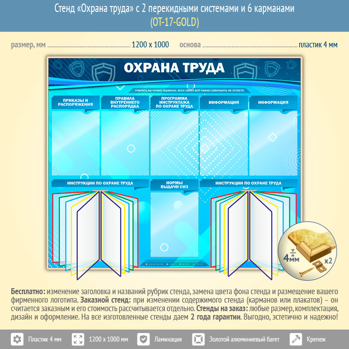 Стенд «Охрана труда» с 2 перекидными системами и 6 карманами (OT-17-GOLD)