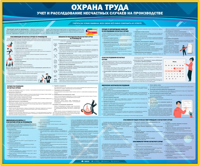 Стенд «Охрана труда. Учет и расследование несчастных случаев на производстве» (OT-24) содержит следующую информацию: классификация несчастных случаев на производстве, обязанности работодателя при несчастном случае на производстве, порядок расследования несчастных случаев, Порядок по формированию комиссий по расследованию несчастных случаев, сроки расследования несчастных случаев, оформление материалов расследования, оформление акта формы Н-1 и Н-1б о несчастном случае на производстве, классификатор видов происшествий приведших к несчастному случаю, Классификатор причин несчастного случая.