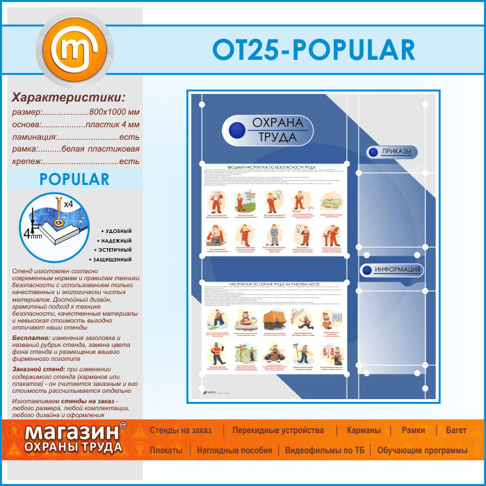 Стенд «Охрана труда» – это дизайнерский подход к оформлению стенда, содержащий в себе полезную информацию по охране труда: вводный инструктаж по безопасности труда, инструктаж по охране труда на рабочем месте и два плоских кармана А4 формата под приказы и информацию по охране труда…