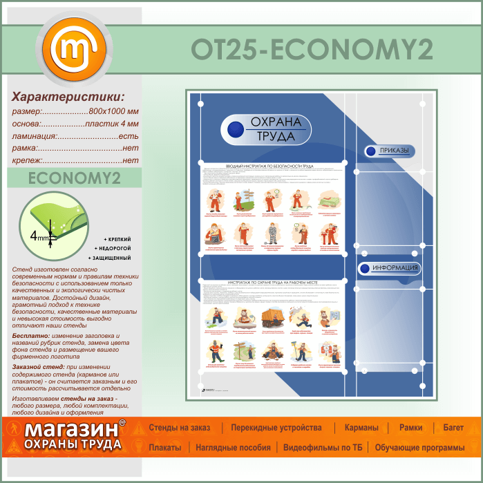 Стенд «Охрана труда» – это дизайнерский подход к оформлению стенда, содержащий в себе полезную информацию по охране труда: вводный инструктаж по безопасности труда, инструктаж по охране труда на рабочем месте и два плоских кармана А4 формата под приказы и информацию по охране труда…