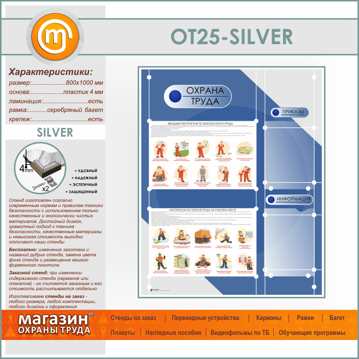 Стенд «Охрана труда» – это дизайнерский подход к оформлению стенда, содержащий в себе полезную информацию по охране труда: вводный инструктаж по безопасности труда, инструктаж по охране труда на рабочем месте и два плоских кармана А4 формата под приказы и информацию по охране труда…