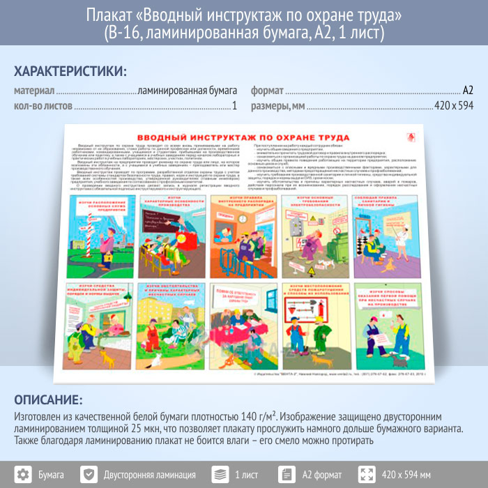 Плакат «Вводный инструктаж по охране труда» (В-16, ламинированная бумага, А2, 1 лист)