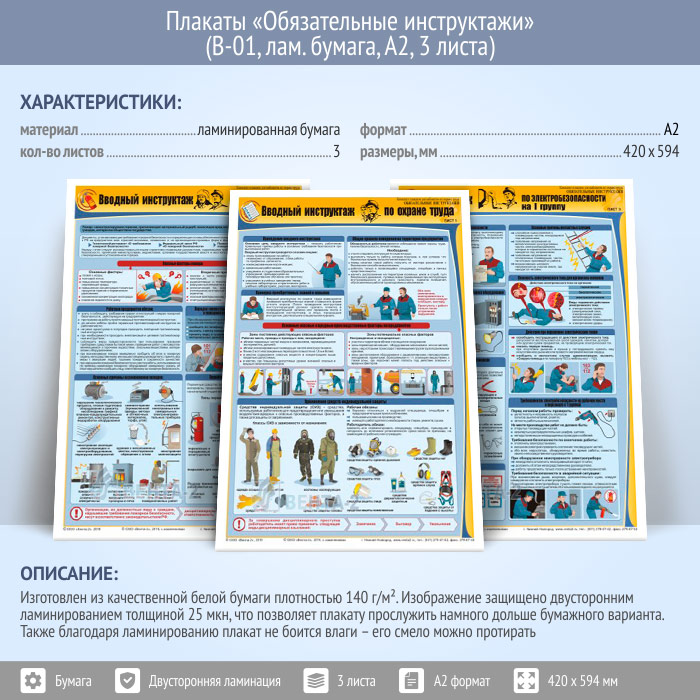 Плакаты «Обязательные инструктажи» (вводный инструктаж, вводный противопожарный инструктаж, инструктаж на I группу по электробезопасности) (В-01, ламинированная бумага, А2, 3 листа)