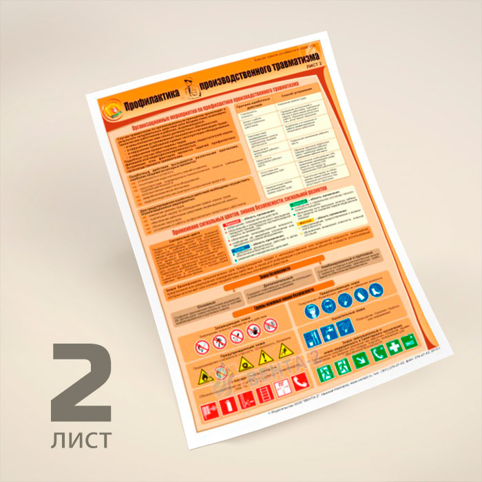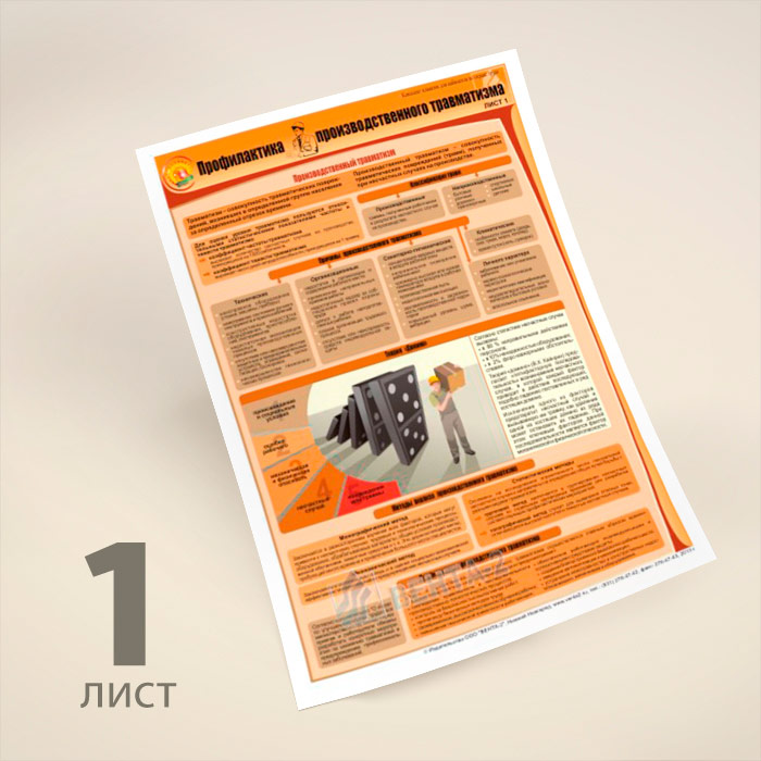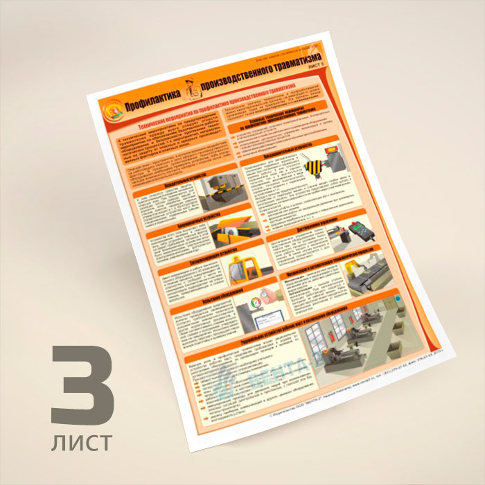 В комплекте плакатов из 3 листов «Профилактика производственного травматизма» описываются причины производственного травматизма (ПТ), организационные мероприятия по профилактике ПТ, технические мероприятия по профилактике ПТ