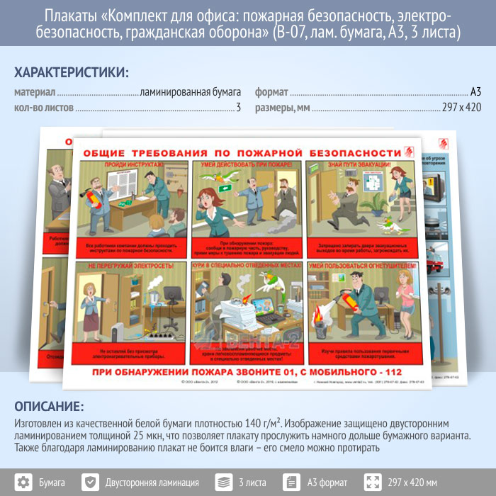 Плакаты «Комплект для офиса: пожарная безопасность, электробезопасность, гражданская оборона» (В-07, ламинированная бумага, А3, 3 листа)
