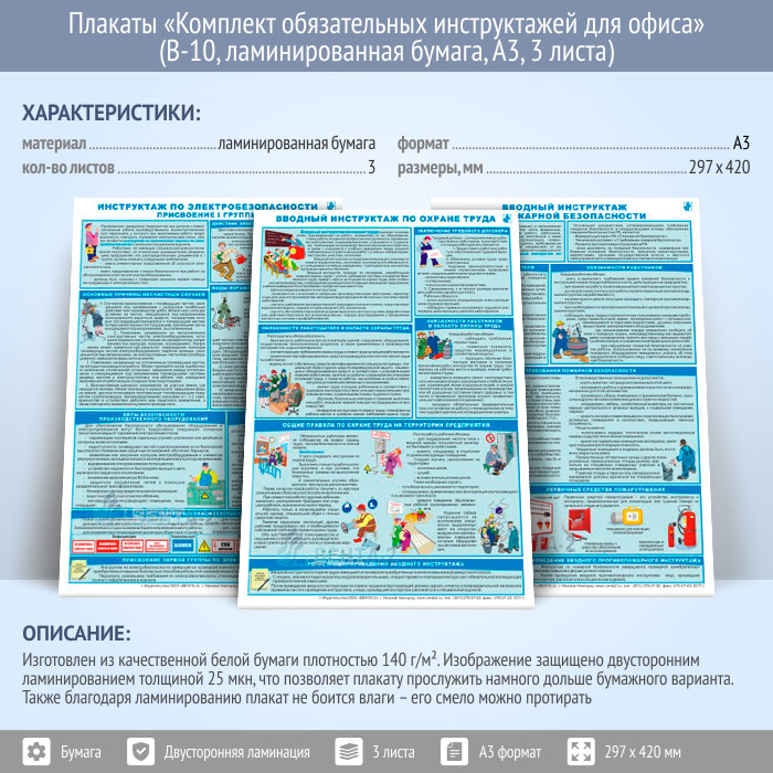 Плакаты «Комплект обязательных инструктажей для офиса» (В-10, ламинированная бумага, А3, 3 листа)