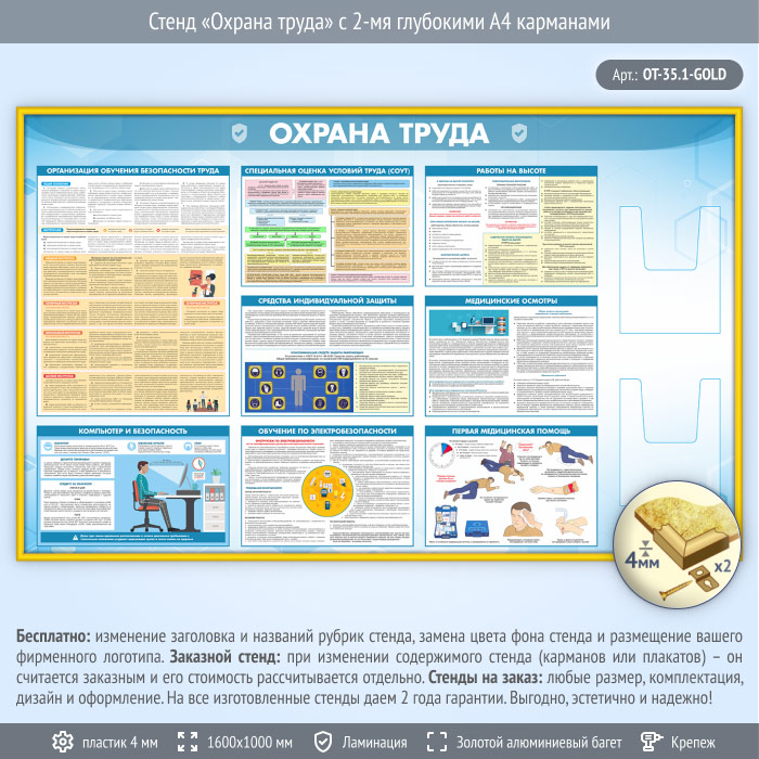 Стенд «Охрана труда» с 2-мя глубокими А4 карманами (OT-35.1-GOLD)