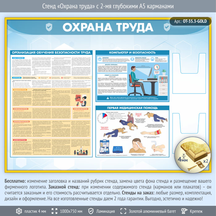 Стенд «Охрана труда» с 2-мя глубокими А5 карманами (OT-35.3-GOLD)
