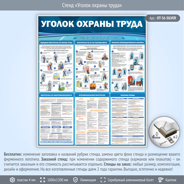 Стенд «Уголок охраны труда» (OT-36) содержит вводный инструктаж по ОТ, инструктаж по ОТ на рабочем месте, информацию об опасных производственных факторах, об опасных отходах, а также инструктажи по электробезопасности и по пожарной безопасности.
