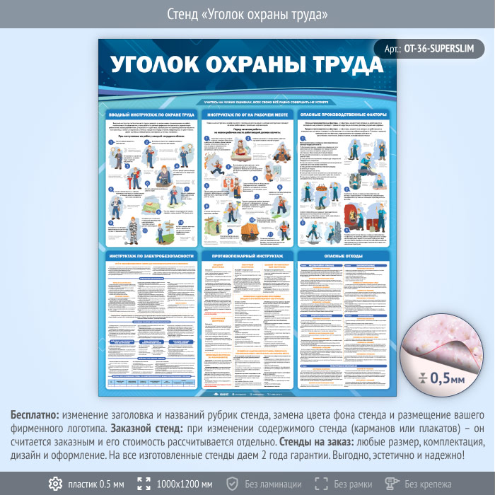 Стенд «Уголок охраны труда» (OT-36) содержит вводный инструктаж по ОТ, инструктаж по ОТ на рабочем месте, информацию об опасных производственных факторах, об опасных отходах, а также инструктажи по электробезопасности и по пожарной безопасности.