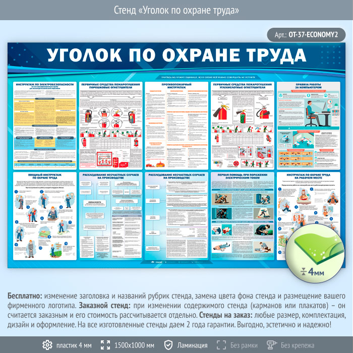 Стенд «Уголок по охране труда» (OT-37) содержит самую важную информацию по охране труда.