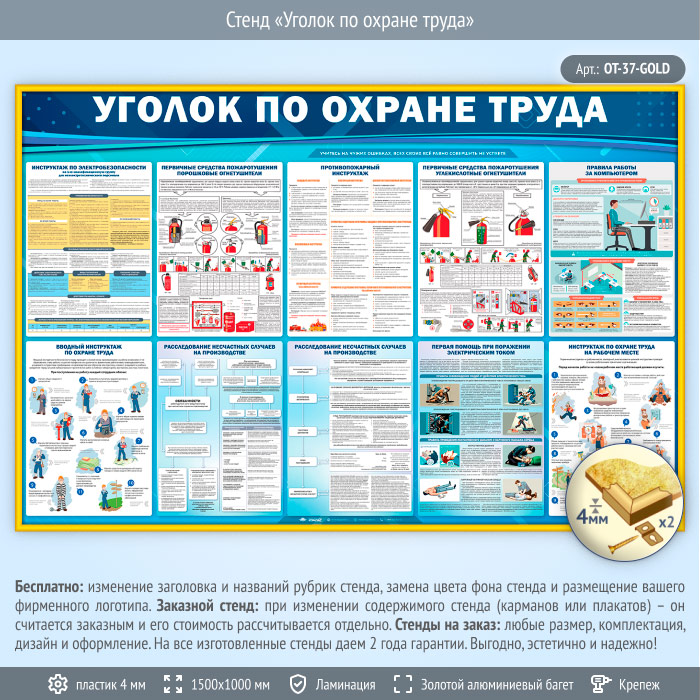 Стенд «Уголок по охране труда» (OT-37) содержит самую важную информацию по охране труда.