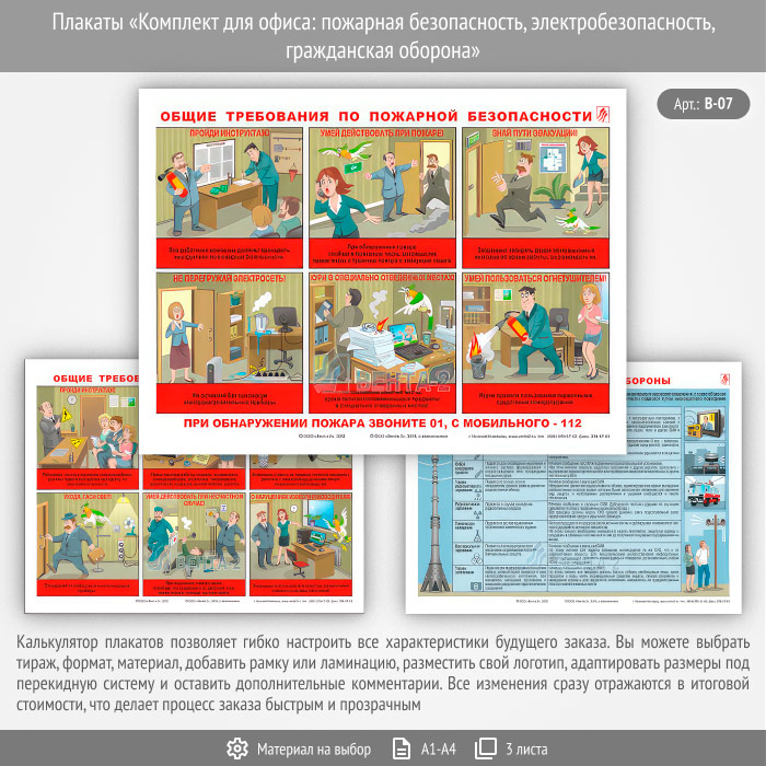 Плакаты «Комплект для офиса: пожарная безопасность, электробезопасность, гражданская оборона» (В-07, 3 листа)