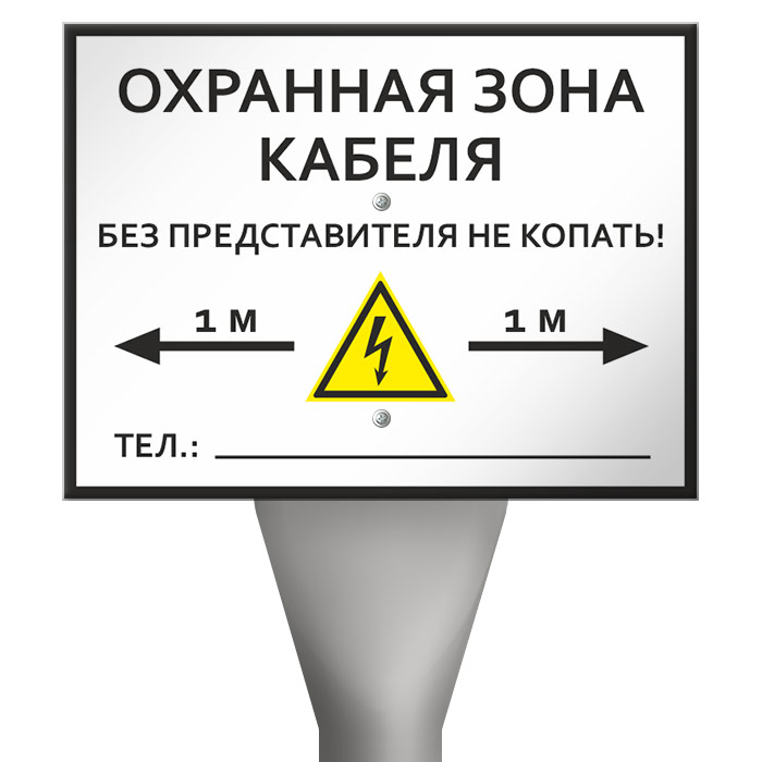 Столбик кабельный СКТ-1,6 с металлической табличкой OZK-06 «Охранная зона кабеля» на металле, размером 400х300 мм устанавливается для обозначения зоны залегания кабеля в местах его пересечения с автомобильной дорогой и другими коммуникациями. Знак должен быть установлен на определенном расстоянии от земли – на высоте человеческого роста (1,7 м). На нем обязательно размещение таких данных, как адрес и телефон эксплуатирующего линию предприятия, размеры охранной зоны