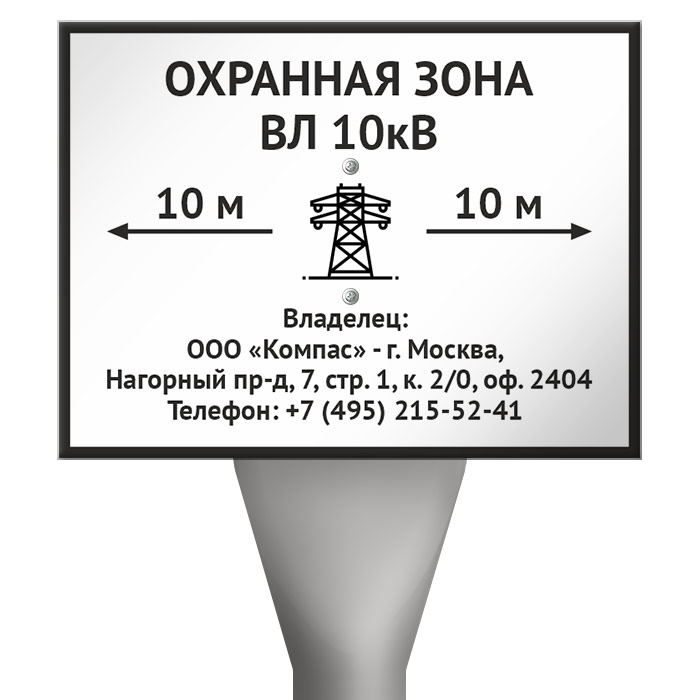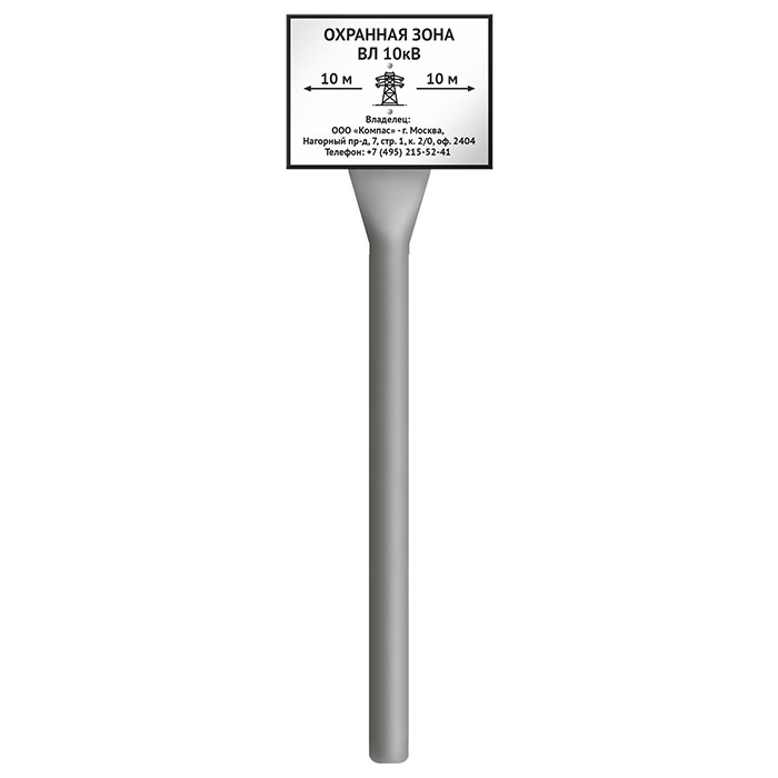 Столбик кабельный СКТ-1,6 с металлическим знаком OZK-07 «Охранная зона ВЛ 10 кВ (высоковольтной линии)» на металле, размером 400х300 мм устанавливается для обозначения зоны залегания кабеля в местах его пересечения с автомобильной дорогой и другими коммуникациями. Знак должен быть установлен на определенном расстоянии от земли – на высоте человеческого роста (1,7 м). На нем обязательно размещение таких данных, как адрес и телефон эксплуатирующего линию предприятия, размеры охранной зоны