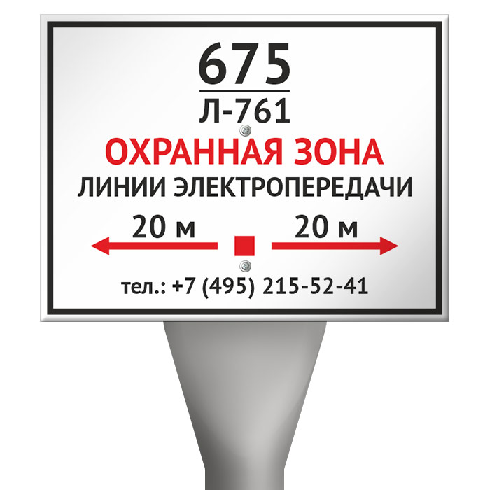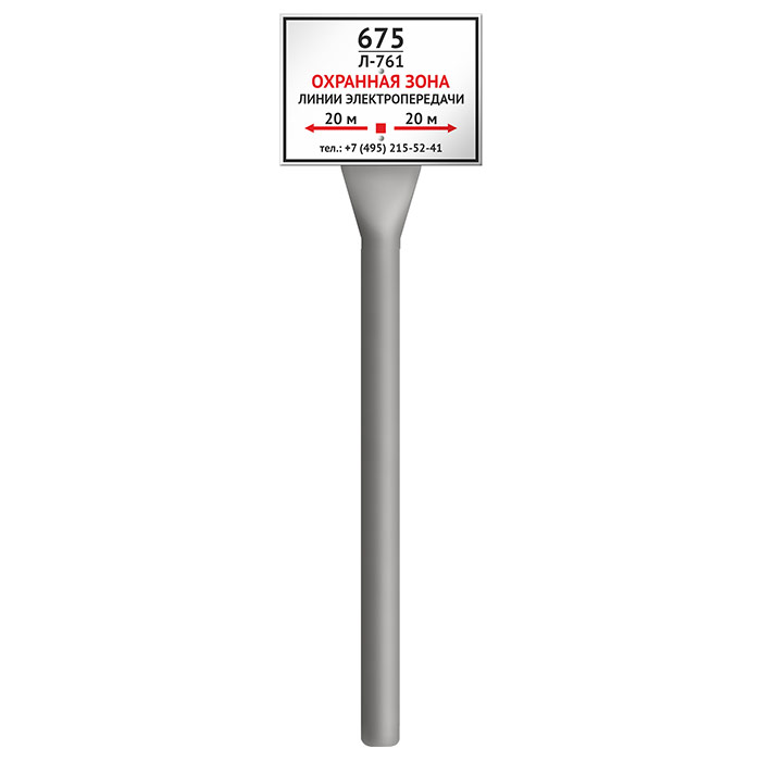 Столбик кабельный СКТ-1,6 с металлической табличкой OZK-09 «Охранная зона линии электропередачи» на металле, размером 400х300 мм устанавливается для обозначения зоны залегания кабеля в местах его пересечения с автомобильной дорогой и другими коммуникациями. Знак должен быть установлен на определенном расстоянии от земли – на высоте человеческого роста (1,7 м). На нем обязательно размещение таких данных, как адрес и телефон эксплуатирующего линию предприятия, размеры охранной зоны