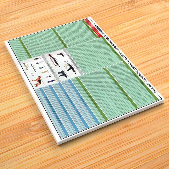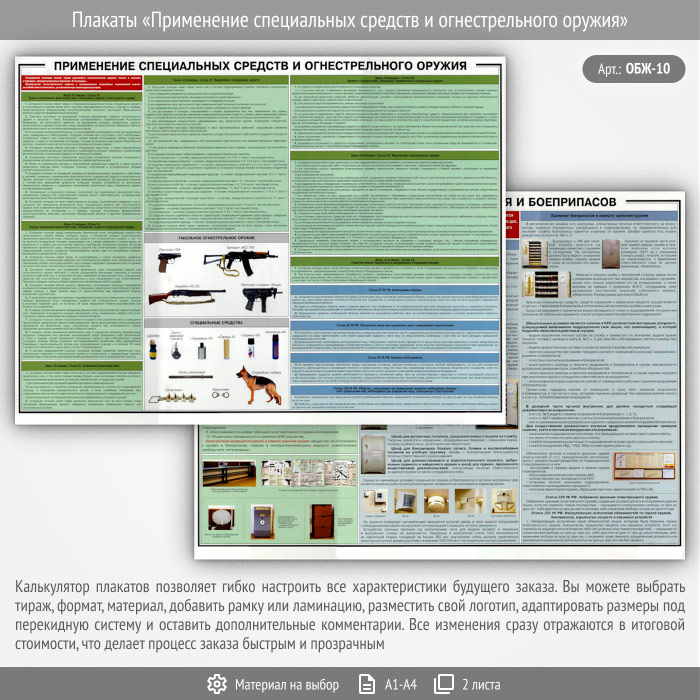 Комплект плакатов «Применение специальных средств и огнестрельного оружия» из 2 листов в доступной форме раскрывает обозначенную тему
