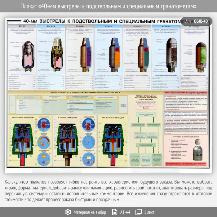 Плакат «40-мм выстрелы к подствольным и специальным гранатометам» (ОБЖ-40, 1 лист)
