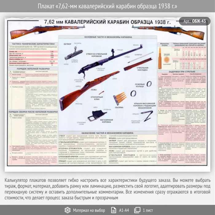 Плакат «7,62-мм кавалерийский карабин образца 1938 г.» (ОБЖ-43, 1 лист)