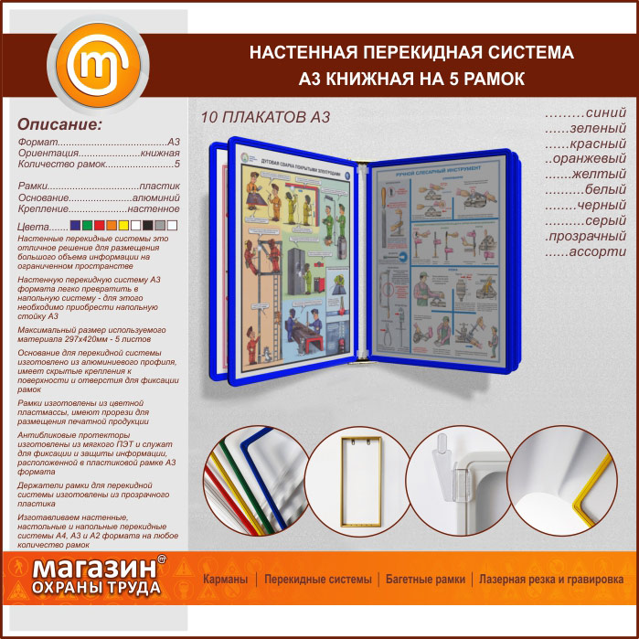 Данная настенная перекидная система позволяет компактно разместить 5 листов А3 формата. Ориентация рамок - книжная.
