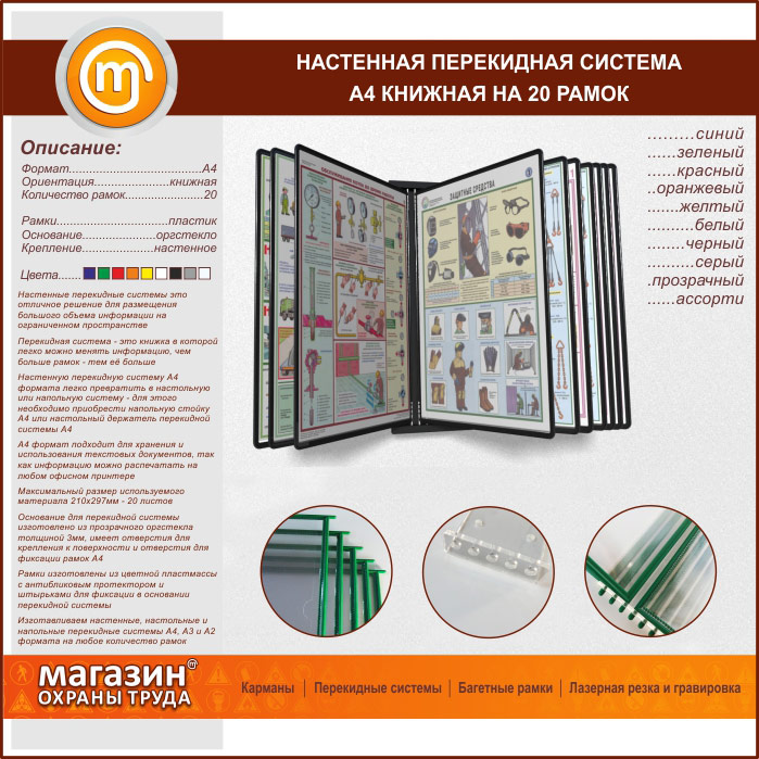 Данная настенная перекидная система позволяет компактно разместить 20 листов А4 формата. Ориентация рамок - книжная.