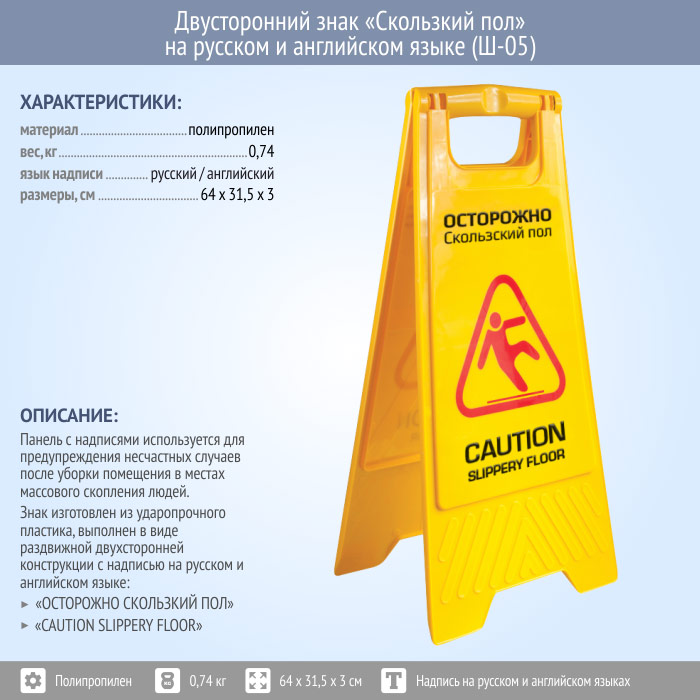 Двусторонний знак «Скользкий пол» это по сути панель, напоминающая по форме штендер с надписями с обеих сторон. Данный знак используется для предупреждения несчастных случаев после уборки помещения в местах массового скопления людей. Изготовлен из ударопрочного пластика. Надписи выполнены на русском и английском языке: