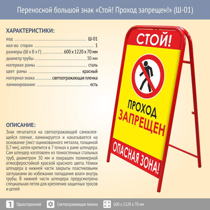 Переносной большой знак «Стой! Проход запрещен!» (Ш-01, односторонний, светоотражающая пленка). Констукция знака в сложенном виде имеет размер 650 х 1220 х 70 мм. Размер печатной области - 1120 х 590 мм. Изображение печатается на светоотражающей самоклеящейся пленке, ламинируется и накатывается на основание (лист оцинкованного металла, толщиной 0,7 мм), затем крепится в 7 точках к раме штендера с одной стороны.