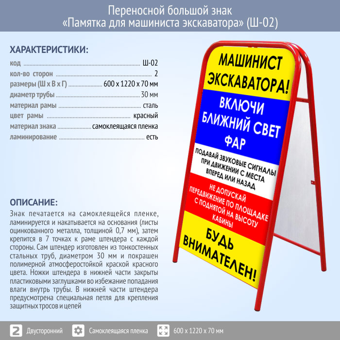 Переносной большой знак «Памятка для машиниста экскаватора» (Ш-02, двусторонний, самоклеящаяся пленка). Констукция знака в сложенном виде имеет размер 650 х 1220 х 70 мм. Размеры печатных областей - 1120 х 590 мм. Изображения печатаются на самоклеящейся пленке, ламинируются и накатываются на основания (листы оцинкованного металла, толщиной 0,7 мм), затем крепятся в 7 точках к раме штендера с двух сторон.