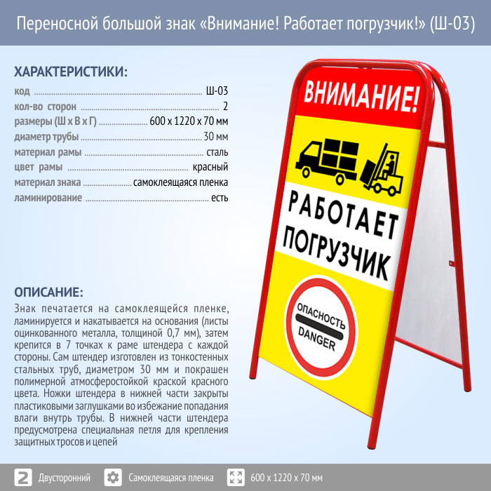 Переносной большой знак «Внимание! Работает погрузчик!» (Ш-03, двусторонний, самоклеящаяся пленка). Констукция знака в сложенном виде имеет размер 650 х 1220 х 70 мм. Размеры печатных областей - 1120 х 590 мм. Изображения печатаются на самоклеящейся пленке, ламинируются и накатываются на основания (листы оцинкованного металла, толщиной 0,7 мм), затем крепятся в 7 точках к раме штендера с двух сторон.