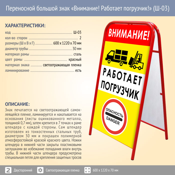 Переносной большой знак «Внимание! Работает погрузчик!» (Ш-03, двусторонний, светоотражающая пленка). Констукция знака в сложенном виде имеет размер 650 х 1220 х 70 мм. Размеры печатных областей - 1120 х 590 мм. Изображения печатаются на светоотражающей самоклеящейся пленке, ламинируются и накатываются на основания (листы оцинкованного металла, толщиной 0,7 мм), затем крепятся в 7 точках к раме штендера с двух сторон.