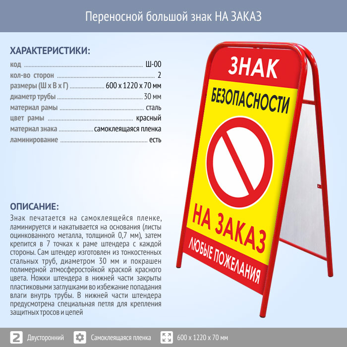 Переносной большой знак НА ЗАКАЗ (двусторонний, самоклеящаяся пленка). Констукция знака в сложенном виде имеет размер 650 х 1220 х 70 мм. Размеры печатных областей - 1120 х 590 мм. Изображения печатаются на самоклеящейся пленке, ламинируются и накатываются на основания (листы оцинкованного металла, толщиной 0,7 мм), затем крепятся в 7 точках к раме штендера с двух сторон.