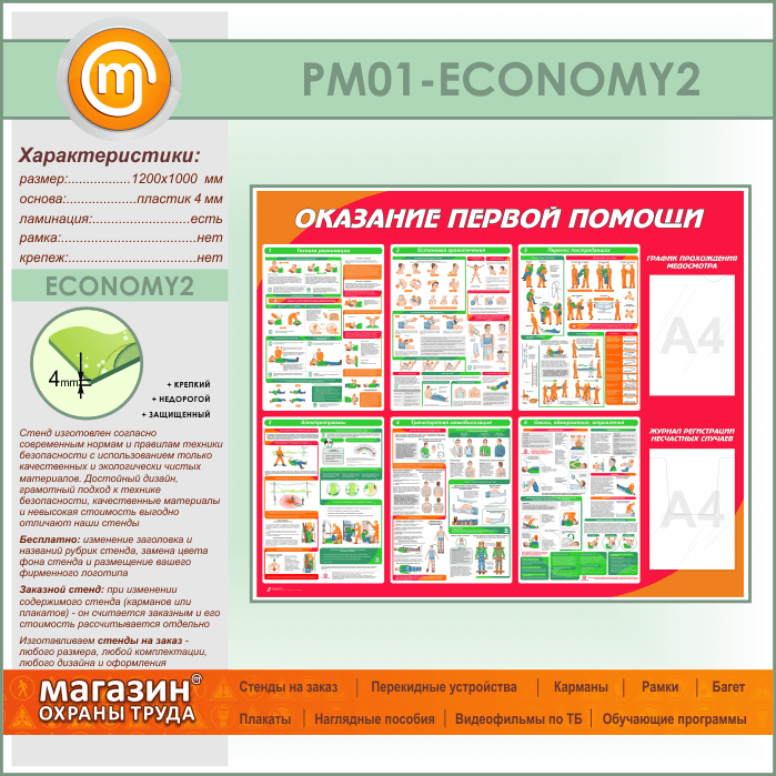 Стенд «Оказание первой помощи» – это яркое и наглядное пособие для самостоятельного изучения приемов оказания доврачебной помощи: техника реанимации, остановка кровотечения, перенос пострадавших, электротравмы, транспортная иммобилизация, ожоги, обморожения, отравления, также на стенде установлен плоский карман А4 формата для графика прохождения медосмотра и объемный карман для журнала регистрации несчастных случаев…