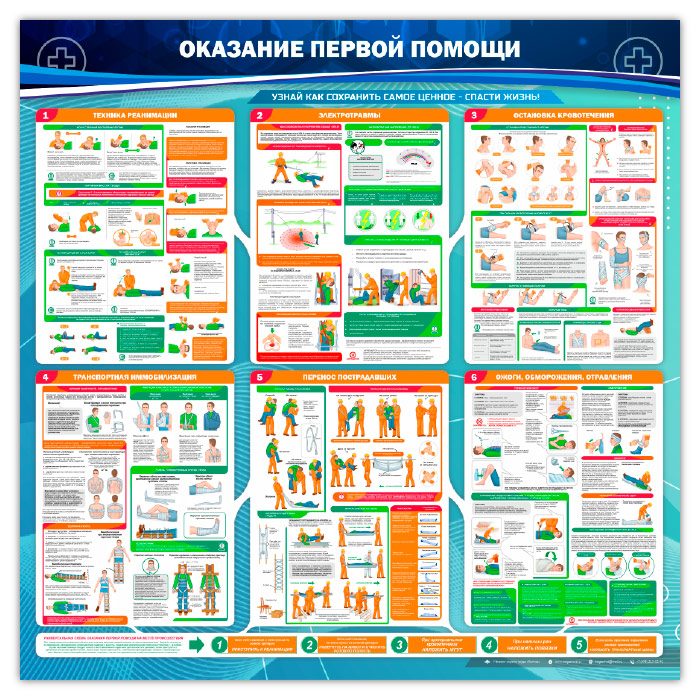 Стенд «Оказание первой помощи» – это яркое и наглядное пособие для самостоятельного изучения приемов оказания доврачебной помощи: техника реанимации, остановка кровотечения, перенос пострадавших, электротравмы, транспортная иммобилизация, ожоги, обморожения, отравления, приведена универсальная схема оказания первой медицинской помощи на месте происшествия…