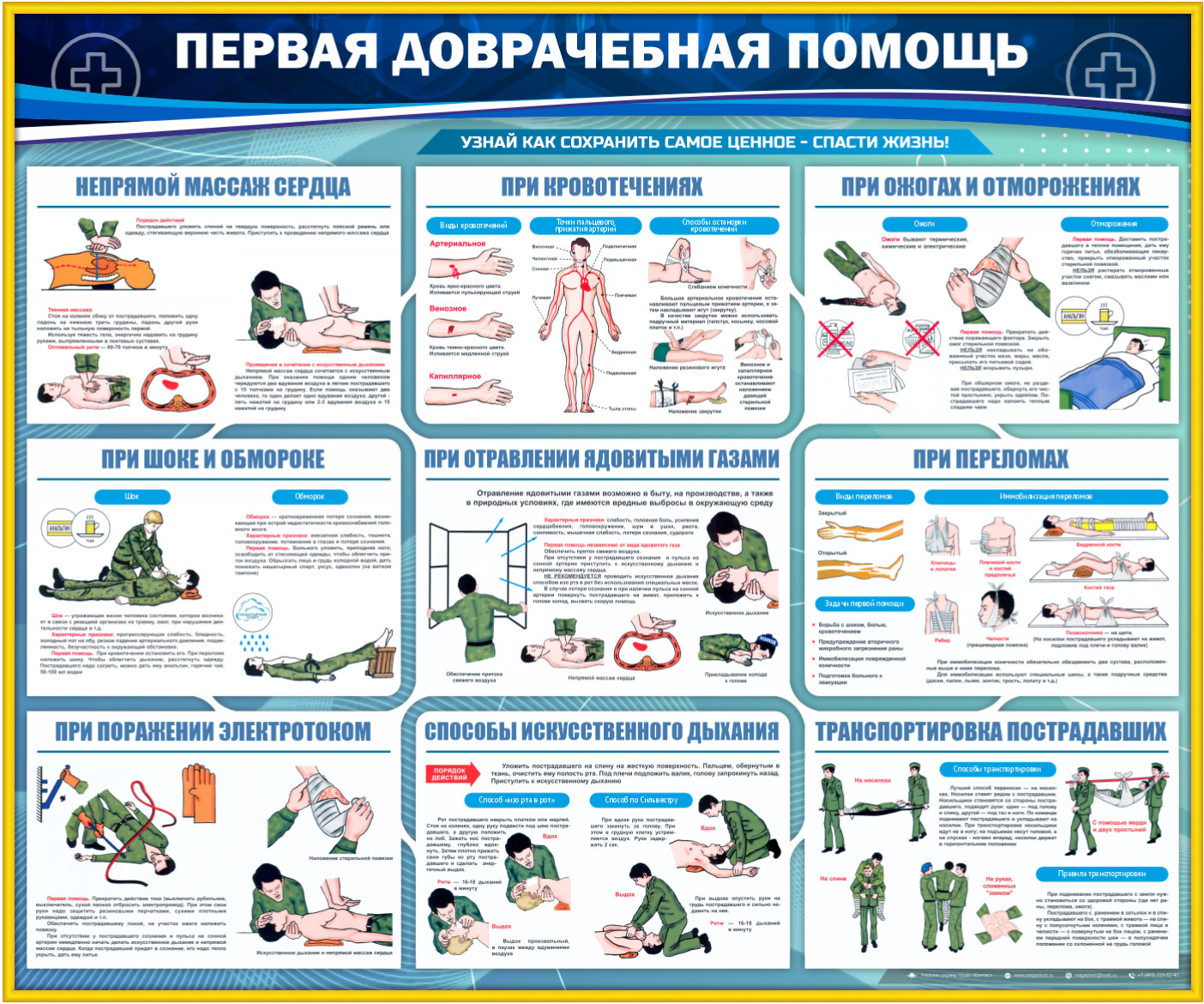 Стенд «Первая доврачебная помощь» – самая необходимая информация для оказания первой помощи пострадавшим: непрямой массаж сердца; помощь при кровотечениях, ожогах и отморожениях, действия при шоке и обмороке, помощь при отравлении ядовитыми газами и способы искусственного дыхания, действия при переломах и переноска пострадавших, первая помощь при поражении электрическим током…