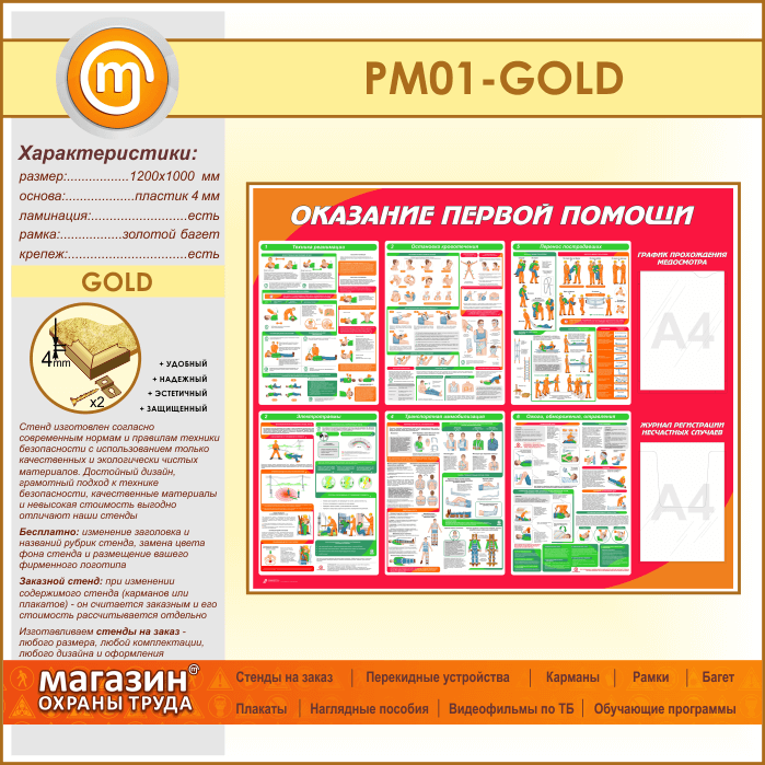 Стенд «Оказание первой помощи» с плоским и объемным карманами (PM-01-GOLD)