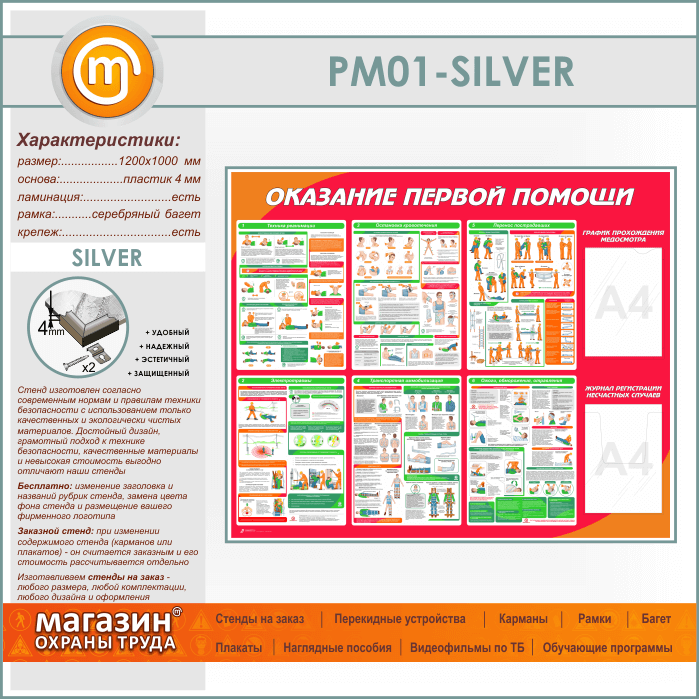 Стенд «Оказание первой помощи» с плоским и объемным карманами (PM-01-SILVER)