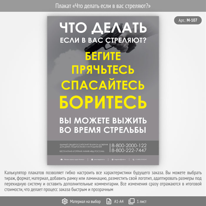 Агитационный плакат «Что делать если в вас стреляют?» может быть изготовлен любого формата и размера, на бумаге, самоклеящейся пленке, пластике, баннерной ткани и металле. Разрабатываем, рисуем и изготавливаем плакаты на любую интересующую Вас тему