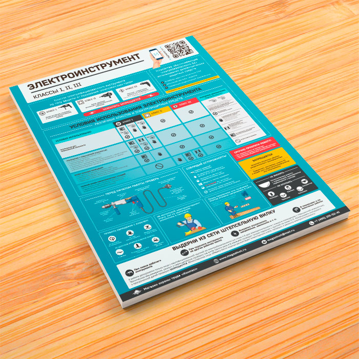 Плакат «Электроинструмент – электробезопасность» содержит такие важные темы как классы электрифицированного инструмента по типу защиты от поражения электрическим током, условия использования электроинструмента различных классов и электрозащитных средств, правила техники безопасности с электроинструментом