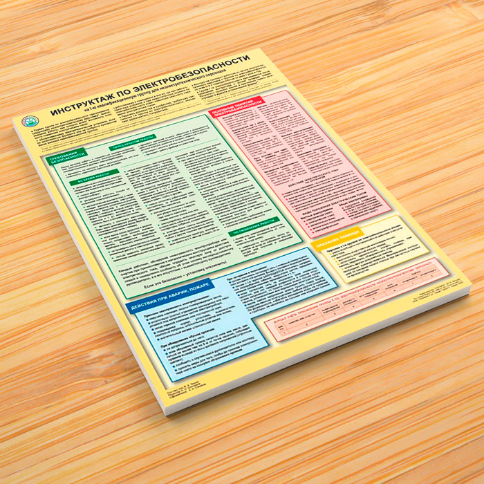 Плакат «Инструктаж по электробезопасности – на 1 квалификационную группу для неэлектротехнического персонала» содержит требования безопасности перед началом работ, во время выполнения работ и по окончании работ. В плакате описаны основные понятия электробезопасности, действия при аварии и пожаре, оказание помощи при поражении электротоком