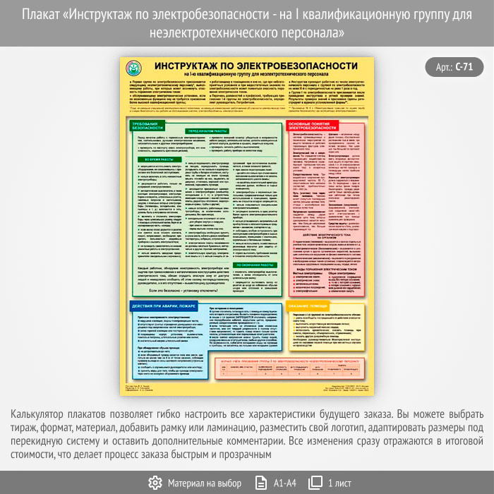 Плакат «Инструктаж по электробезопасности - на I квалификационную группу для неэлектротехнического персонала» (С-71, 1 лист)