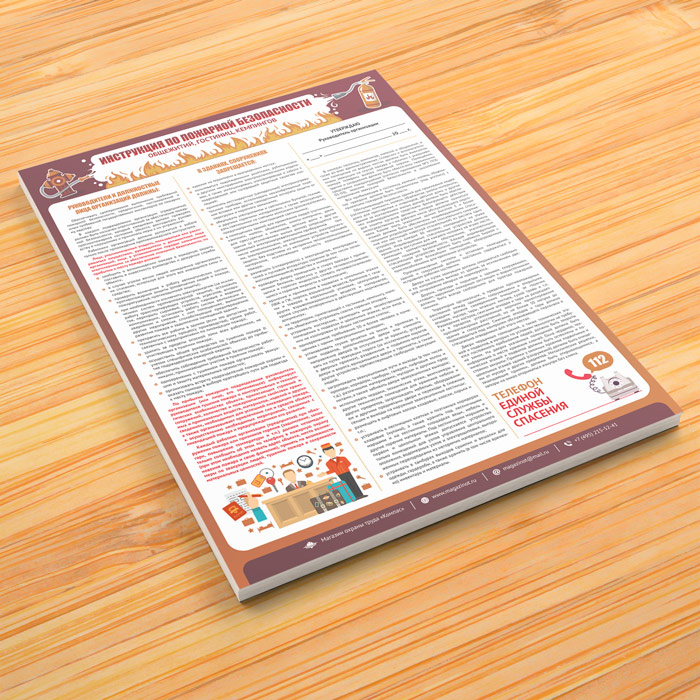 Плакат «Инструкция по пожарной безопасности общежитий, гостиниц, кемпингов» может быть изготовлен любого формата и размера, на бумаге, самоклеящейся пленке, пластике, баннерной ткани и металле. Разрабатываем, рисуем и изготавливаем плакаты на любую интересующую Вас тематику