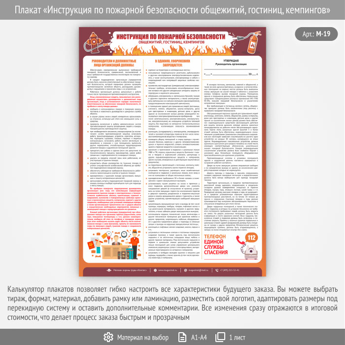 Плакат «Инструкция по пожарной безопасности общежитий, гостиниц, кемпингов» (М-19, 1 лист)