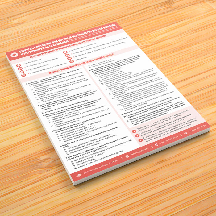 Плакат «Перечень состояний, при которых оказывается первая помощь и мероприятий по ее оказанию» разработан на основе Приказа Министерства здравоохранения и социального развития РФ от 4 мая 2012 г. N 477н «Об утверждении перечня состояний, при которых оказывается первая помощь, и перечня мероприятий по оказанию первой помощи»